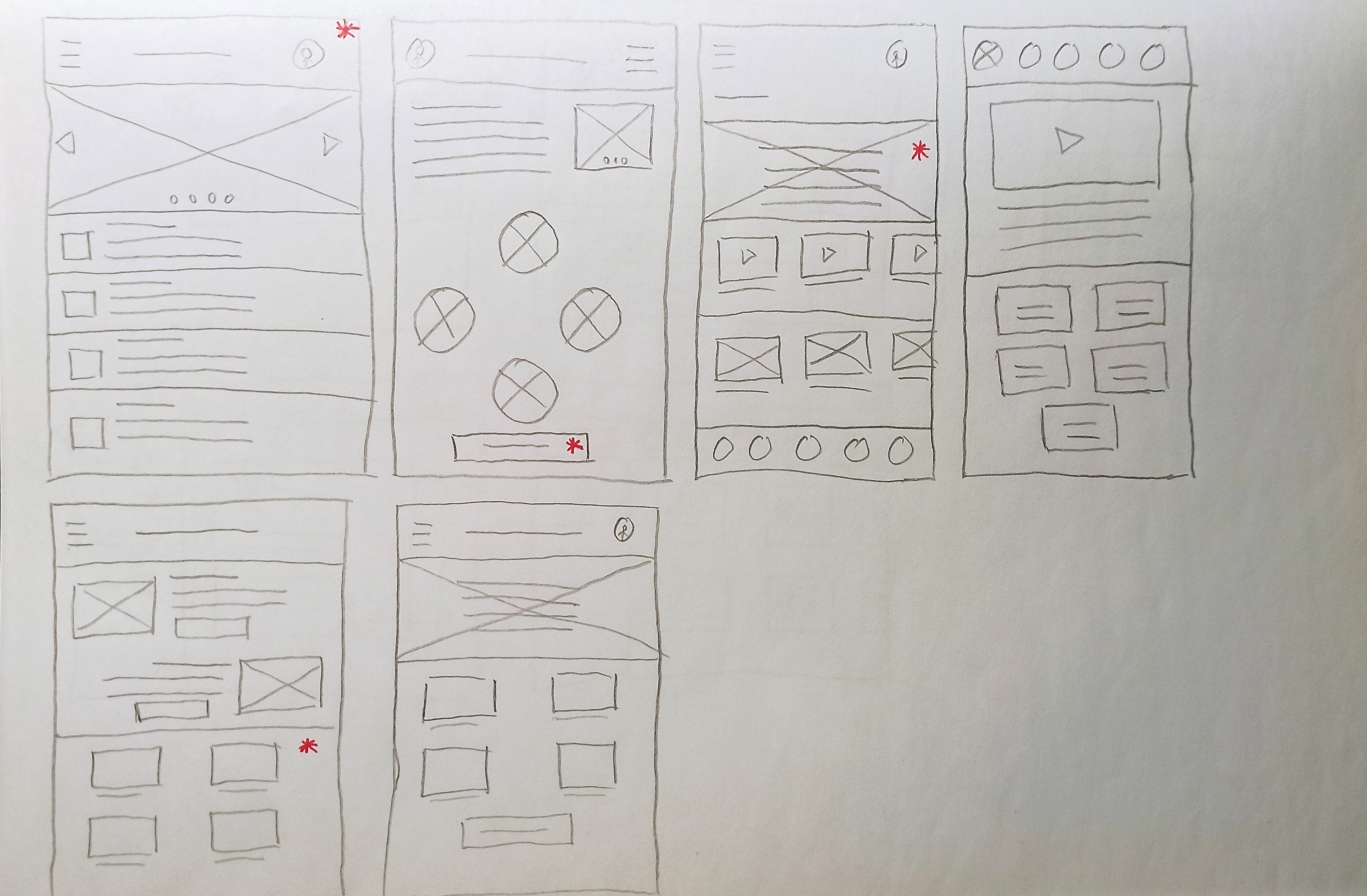 Elaboré esquemas de página para poder plantear rápidamente diseños antes de realizarlo en formato digital. Opté por unos que dieran una breve información inicial al usuario y facilitara su navegación por los apartados más relevantes.